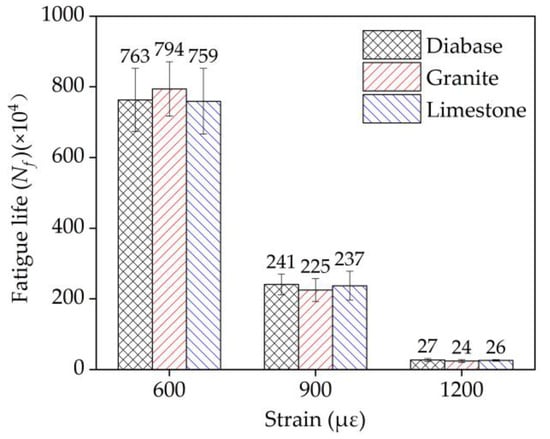 The EAC mixture sample exhibited an endurance limit at a strain level lower than 500 με, and its modulus basically became steady upon reaching 60–70% of the initial stiffness, after which there was no significant change in its fatigue trend. On this basis, the fatigue property differences among the EAC samples containing diabase, granite, and limestone were evaluated at strain levels of 600 με, 900 με, and 1200 με. The influences of aggregate strength on the fatigue and rheological properties of the EACs were analyzed.
