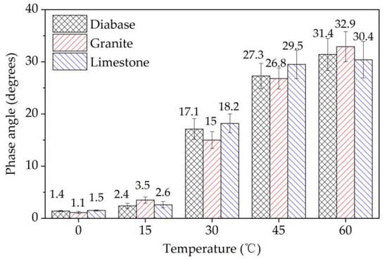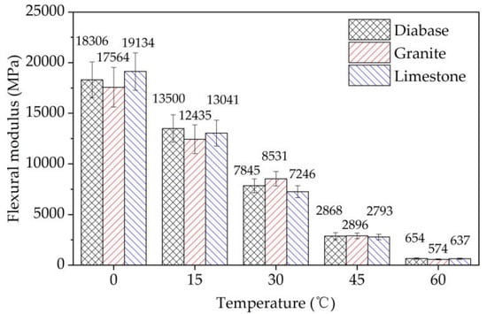 The initial flexural modulus and phase angle were obtained in the four-point bending tests to analyze the viscoelastic nature of the EACs, as shown in Figure 20 and Figure 21, respectively. The experimental data showed that as the test temperature increased, the modulus values of the EACs decreased, and the phase angle values of the EACs increased. This pattern also explains why when the temperature decreases, the effect of aggregate strength on the cracking performance of EAC gradually increases. Epoxy asphalt is the main factor influencing the viscoelasticity of EAC. The EACs showed elasticity below 15 °C and viscoelasticity above 30 °C. The aggregate strength had no evident influence on the initial flexural modulus or phase angle of the EACs, which was the same as the effect of different strength aggregate strengths on the fatigue performance of the EACs.