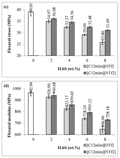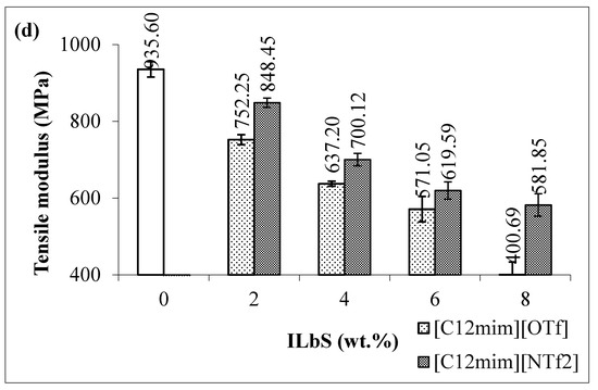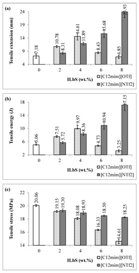 Figure 1a,b shows the tensile extension and tensile energy at maximum load of the PBS/RS blends without and with different contents and types of ILbS. Consequently, it can be seen that the tensile extension of the blend without ILbS (0 wt.%) is lower compared to the blends containing ILbS. This is because of the incompatibility between PBS and RS in the blend caused low tensile extension. The increase of the tensile extension of the blends containing ILbS is probably due to the ability of ILbS to interact with both non-polar (hydrophobic) PBS and polar (hydrophilic) RS since they have amphiphilic character [5]. In addition, the tensile extension property of the blends considerably increased as the ILbS content slightly increased. Nevertheless, the highest tensile extension of the blend containing [C12mim][OTf] was found at content of 4 wt.% with the increase up to 103%. More than 4 wt.% of [C12mim][OTf] could not extensively increase the tensile extension property of the blends possibly due to the limitation of [C12mim][OTf]. On the other hand, the significant increase of the tensile extension could be observed at the blends containing [C12mim][NTf2], the tensile extension of the blend has increased up to 233% with the addition of 8 wt.%. The tensile energy also demonstrated the similar trend as the tensile extension whereby the increase is up to 97% with the addition of [C12mim][OTf] (4 wt.%), whereas for [C12mim][NTf2] the increase is up to 239% with 8 wt.% addition.