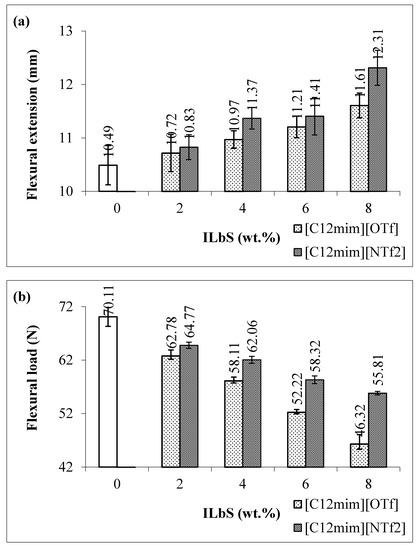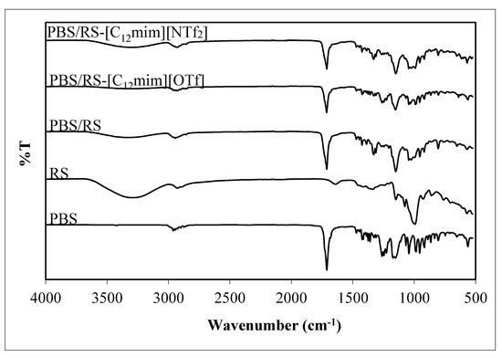 Figure 2a,d indicates the flexural extension, flexural load, flexural stress, and flexural modulus at maximum load of the PBS/RS blends without and with different contents and types of ILbS. From these results, it is apparent that the blends containing ILbS have higher flexural extension compared to the blend without ILbS (0 wt.%). This also attested that the addition of ILbS in the polymer blend system improved the compatibility between PBS and RS. The presence of 8 wt.% of [C12mim][OTf] increased the flexural extension of the blend up to 11%. Furthermore, the addition of 8 wt.% of [C12mim][NTf2] in the blend also significantly increased the flexural extension up to 17%. Nevertheless, the flexural load of the blends has decreased with the addition of ILbS. This is possibly due to the fact that the easier the blends are to bend, the less load required. In addition, the decrease in the flexural load is directly proportional to the increase of ILbS content. Moreover, it was found that the flexural stress and flexural modulus of the PBS/RS blends have the same trend as the flexural load result, hence the cause for this occurrence was also similar. Further, FTIR characterization was performed to determine the existence of interactions between PBS and RS in the blend system.