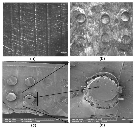 Furthermore, the SEM examination, as indicated in Figure 4c, ascertained the uniform distribution of the fiber orientation. The fiber holes, as seen in Figure 4c, were respectively arranged parallel to one another. At higher magnification, the PE fiber was observed to be thoroughly embedded in the polymeric PCU matrix with the surrounding formed ring of PCU-PE fiber interface (Figure 4d).