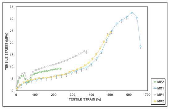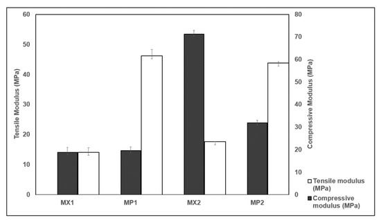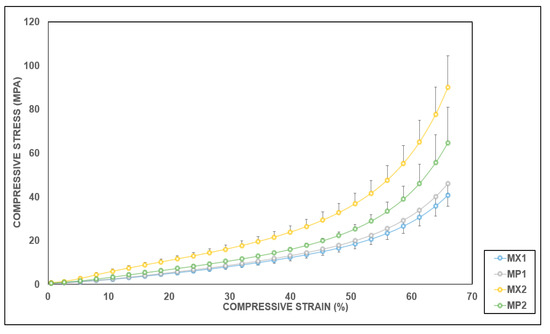 The stress–strain graphs for the average values of the tested samples for both tension and compression tests were plotted in Figure 6 and Figure 7, respectively. These curves exhibited a linear pattern at low strains. Subsequently, a considerable change followed in the slope presenting a nonlinear behavior that continued until the tested samples began to fail. Both MX1 and MX2 demonstrated typical elastomeric stress–strain behavior [55,64]. The PCUs were not as stiff as their fiber-reinforced composites, which indicates that the increase is a function of the stiffness of both the matrix and the interspersed fibers.