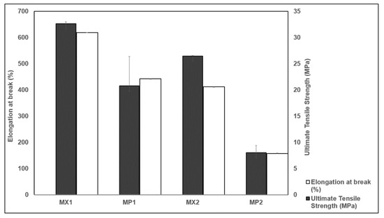 The ultimate tensile strengths of the PCUs were lower than those from the manufacturer’s data sheets (Table 1 and Figure 9). This could be as a result of the disparities in the shape and size of the tested samples, and also the testing technique employed. The average ultimate tensile strength of both composites decreased with fiber reinforcement, and reductions of 36% and 70% were calculated for both MP1 and MP2, respectively. These decreases could be because of the integral sample property, following that tensile strength is a characteristic of both the component materials and the composite samples under examination. Moreover, the tensile properties of polymeric matrix composites are considerably dependent on several factors like the matrix–fiber interface, geometry, distribution and micromechanical deformation [77].