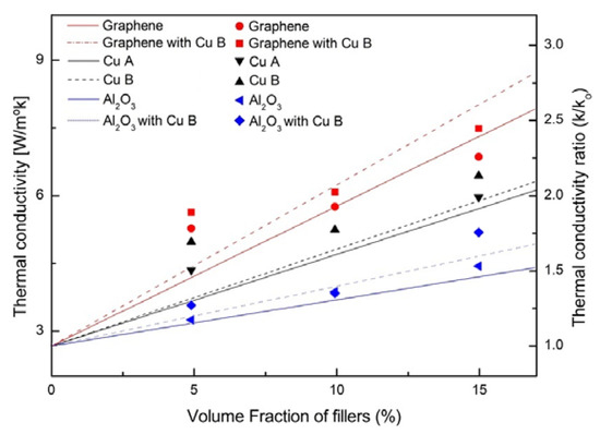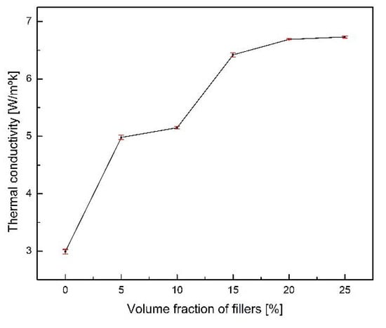 - Up to 15 vol. %, the upward trend of thermal conductivity increases steadily, while after 20 vol. %, the increase trend decreases. In addition, the increase rate of thermal conductivity from 0 to 5 vol. % and 10 to 15 vol. % is the largest.