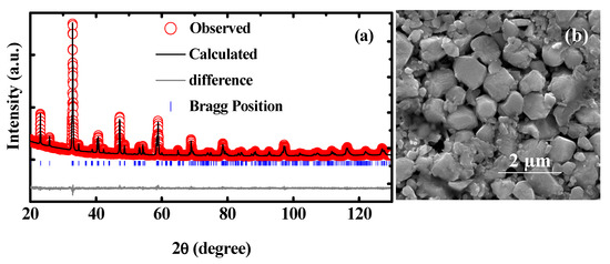 Figure 1a shows the Rietveld refinement result of the XRD data of the NdCrO3 polycrystalline ceramics. The Rietveld refinement with space group Pbnm delivers the lattice parameters of a = 5.420(9) Å, b = 5.483(3) Å, and c = 7.693(3) Å for the compound with a goodness-of-fitting value of χ2 = 1.53 and Rwp = 14.6%. The FESEM image of the NdCrO3 bulk is shown in Figure 1b. The morphology of the sample consisted of irregular grains of different sizes, in which large grains were formed by stacking the thin plate layer by layer.