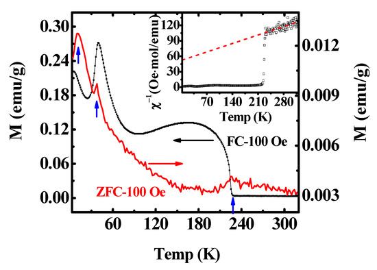 Figure 2 shows the zero-field-cooled (ZFC) and field-cooled (FC) temperature-dependent dc magnetization from 5 K to 320 K under a measuring field of 100 Oe. Two magnetic transitions, TN and TSR, occurred at about 227 K and 38 K, respectively, which were consistent with previous studies [22,24,25,26] and their magnetic behavior could be explained by the strong effective field on the Nd3+ moments exerted by the ordered Cr3+ spin system [27,28]. The first transition temperature TN (227 K) corresponded to canted AFM transition of the Cr3+ magnetic moments and the system showed a weak ferromagnetism. Thus, below TN, the Cr3+ moments configuration was from Γ2(Fx, Cy, Gz) into Γ1(Ax, Gy, Cz) at 38 K (spin reorientation) due to the magnetic crystal anisotropy. From the ZFC curves in Figure 2, a small hump was observed at T ≈ 11.5 K (named as TSP), which originated from the two-level Schottky effect caused by the split of the ‘Nd’ ground doublet [29]. The inset showed the reciprocal of the dc magnetic susceptibility curve (FC) and obeyed the Curie–Weiss law. Furthermore, the derived effective magnetic moment was ~5.845 μB/f.u., which was bigger than the theoretical one (5.3 μB/f.u.). The difference was either due to the magnetic polarization of the Nd moments by the Cr moments or ascribed to a slight change of the susceptibility due to the crystal field splitting effects of the excited 7FJ levels [23].