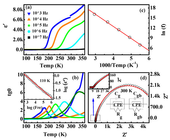 where ƒ0 is the pre-exponential, Ea is the activation energy. Figure 3c shows the Arrhenius plots of tan δ for the relaxation. The solid line shows the fitting to the experiment data by Equation (1). The activation energy was derived to be about 0.313 eV. Therefore, the type of dielectric relaxation was not attributed to the mobility of oxygen vacancies. (b) Maxwell–Wagner relaxation originating from different conductivities between regions in the sample [31]. The characteristic of the Maxwell–Wagner relaxation mechanism is the f−1 dependence of the imaginary part of dielectric constant data (ε″) at lower frequencies [23,31]. The slope of log(ε″) vs. log(f) is about (−1) in the frequency range of 102–106 Hz, as shown in the inset of Figure 3b at 110 K, clearly suggesting the presence of the Maxwell–Wagner relaxation. Since the contributions arising from grain (g), grain boundary (gb), and specimen-electrode interface can be separated by Nyquist plots [32], the Nyquist plot (Z” vs. Z’) was studied (shown in Figure 3d). The Nyquist plot was well fitted with an equivalent circuit. The circuit made up of two sub-circuits in the series indicated that there were two relaxations corresponding to the grain boundaries and grains [32,33].