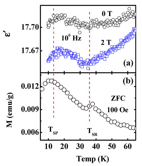 Figure 4a shows the dielectric behavior at a high frequency (106 Hz) in 5 K–65 K at zero and 2 T fields. At a zero magnetic field, there were dielectric anomalies around TSR and TSP marked in Figure 4b and the behaviors were more significant when an external magnetic field was applied. The results indicated that there are native magnetoelectric coupling. As mentioned before, the magnetic configuration was changed from Γ2(Fx, Cy, Gz) to Γ1(Ax, Gy, Cz) at 38 K. Γ1(Ax, Gy, Cz) configuration is an AFM-type magnetic structure. Therefore, the electric polarization does not arise from the non-collinear magnetism. Yanez-Vilar [7] reported that a polarization may arise as a result of anti-phase AFM domain boundaries, i.e., it does not require non-collinear magnetism or spin-orbit coupling. In addition, Yang reported that an improper polarization originates from an exchange striction mechanism that drives a polar displacement of the oxygen ions located at the magnetic domain walls in SmFeO3 with an orthorhombic structure [9]. Moreover, additional calculations ratified that the mechanism was general among magnetic perovskites with an orthorhombic SmFeO3-like structure. Therefore, we may elucidate the dielectric anomaly by an AFM-type spin arrangement at domain walls that break the spatial inversion symmetry and cause polarization along a specific direction. Such an explanation agrees well with the theoretical calculations for the NdCrO3 material [9].