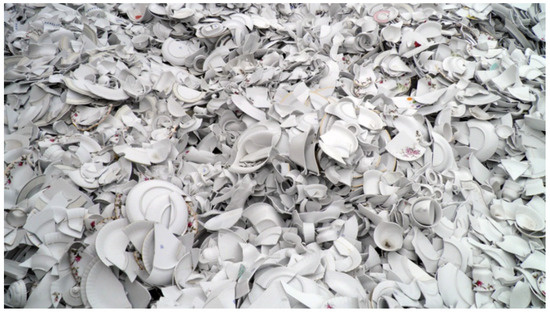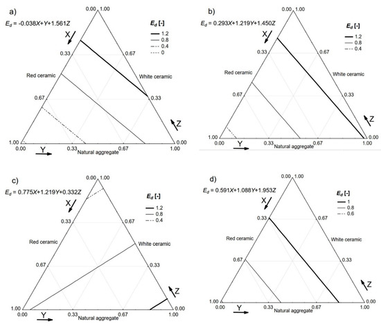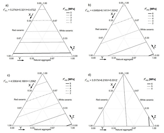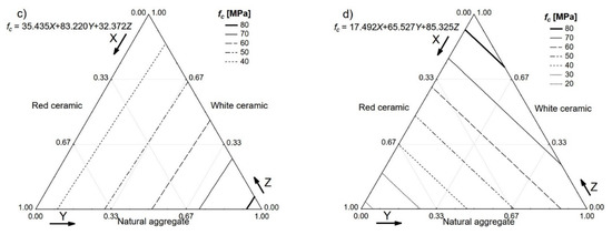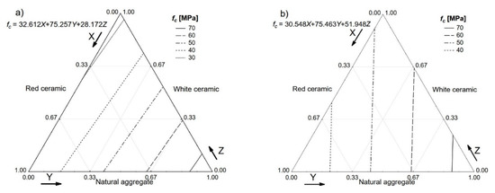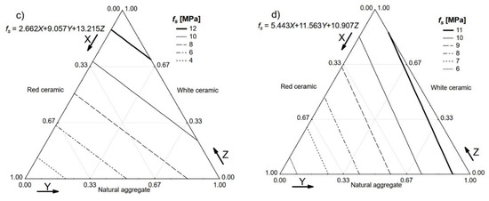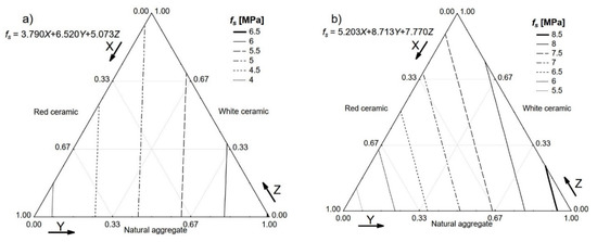 A growing research effort exists globally to successfully harness different ceramic wastes in the construction industry [1,2,3], resulting in some successful applications of different types of waste ceramics as partial full substitutes of fine and coarse natural aggregates [4,5,6]. The type of waste ceramic most often considered for harnessing as a waste aggregate is red (porous, iron oxide-rich) ceramic [4,7], with multiple types of nonstructural concrete elements characterised by less demanding strength characteristics being cast using this kind of waste aggregate [8]. In order to utilise waste ceramic aggregates for the production of structural concrete, a new approach to composition is needed. Different waste ceramic aggregates could be blended together (e.g., red waste ceramic aggregate and white (dense, kaolin-based) waste ceramic aggregate) to achieve a new level of quality in sustainable concrete production, thereby enabling the shaping of aggregate properties to utilise their advantages and harness synergy. Red ceramic is characterised by limited compressive strength due to its porosity (usually between 10 and 15 MPa), but has the advantage of using an internal curing process [7]. White ceramic is characterised by “no porosity” and a much higher compressive strength red ceramic. This research was conducted to prove the proposed novel concept of using waste ceramic aggregates, in which red ceramic obtained from brick production waste and white ceramic obtained from local pottery factory production waste were used as waste aggregates. Both ceramics were processed using the same machinery and grinding procedure to achieve waste aggregates. As a reference, the properties of natural post-glacial aggregates commonly available in countries located along the southern shoreline of the Baltic Sea [9] were chosen. Utilisation of a mixture design was enabled using three aggregates, where the sum of the volume of all three ingredients was always equal to 100%. The mixture design allowed the visualisation of results in the form of ternary contour plots, which are commonly used in technology of binders [10] and concrete [11].