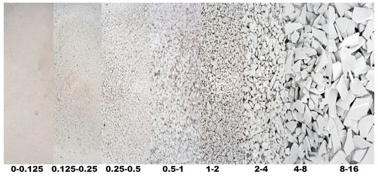 The aggregates were specially prepared for the research programme. Both raw ceramic wastes were ground into particle fractions from 0 to 16 mm. White ceramic waste in a form of crushed pottery rejected during production was used for waste aggregate preparation, as seen in Figure 1. The aggregate particle fractions and particle geometry achieved from this process are shown in Figure 2. The particles were characterised by sharp edges with some rough and smooth surfaces. The shape of particles was also very different from the shape of the sub-rounded grains of the natural aggregate.