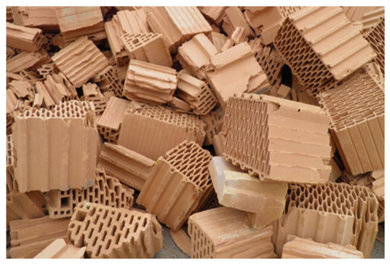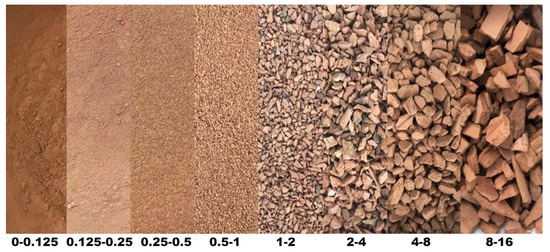 Sourced red waste ceramic is presented in Figure 3. It mainly comprised hollow ceramic wall blocks either crushed during production or rejected during final quality control. Aggregate particle fractions and their geometric characteristics are shown in Figure 4. This aggregate was thoroughly described in previous publications [12].
