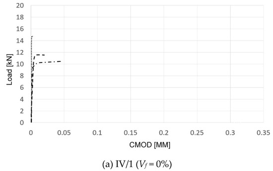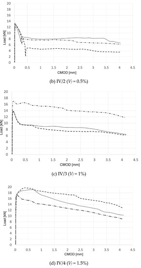 Assessment of flexural characteristics of the concretes in question was based on the registered load–crack mouth opening displacement (CMOD, as defined in EN 14651:2007) relationship. Specimens were considered to be ultimately destroyed after achieving a CMOD equal to 4 mm. Exemplary registered load–CMOD diagrams are presented in Figure 10.