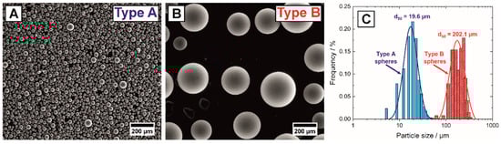 Microstructure (A,B) and particle size distributions (C) of the type A (d50 = 20 µm) and type B (d50 = 200 µm) phenolic resin spheres utilized as spherical pore formers.