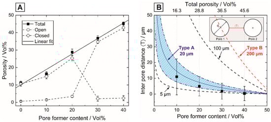 Homogeneous pore distributions were achieved independent from the examined pore former content, showing a good homogenization of the pore formers in the HAp-wax-suspensions due to the wet mixing process, Figure 3. Up to a volume content of 20 Vol% pore formers, the majority of the pores are isolated and thus closed, which was optically confirmed by the SEM micrographs of Figure 3B,E. At higher pore former contents (30 and 40 Vol%) cell windows between adjacent pores are formed and interconnected, open-porous networks with closed porosities less than 2.4 Vol% are generated, Figure 3C,F. Interconnected pore networks are mandatory to ensure the biological integration of implants associated with a complete vascularization and rapid bone ingrowth [44]. The transition from isolated closed pores to an interconnected, open pore network can be described by percolation models and the percolation threshold, representing the critical pore volume content [45,46,47,48]. The determination of the percolation threshold (Φc) for interconnected pore networks is however extremely complex as it strongly depends on several pore parameters such as the shape [46,47], size [48], distribution [45] and packing density [49] and will therefore mainly be determined by the choice and dispersion of the utilized pore formers. For spherical pore networks a theoretical percolation threshold of Φc = 28.965 Vol% [47] is expected, agreeing well with the complete open porosity found in this work at a pore former content of 30 Vol% for 20 µm spherical pore formers. Additionally, the observed closed porosity at 20 Vol% and complete open porosity at 30 Vol% of the 20 µm pore formers is consistent with porous gelcasted Ti, where comparable pore former sizes were used [50]. For a reasonable estimation of the percolation threshold for differently sized pore formers, we propose to determine the mean surface-to-surface inter pore distance . The surface-to-surface interpore distance of spherical pores (transferred from the interparticle distance of spherical inclusions in particle composites) is given by [51]: