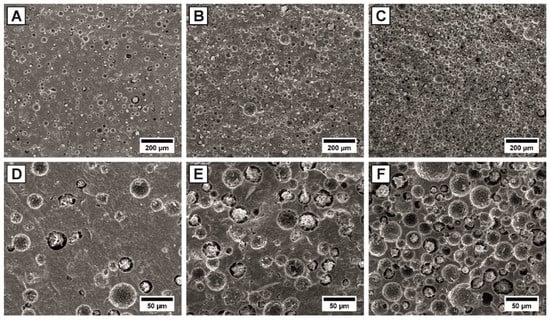 The direct proportionality between the total porosity and the pore former content, shown by the linear regression (R² = 0.995) of Figure 2A, shows the free adjustability of the porosity by utilizing varied amounts of sacrificial templates as pore forming agents [37]. The corresponding microstructure of the 20 µm phenolic resin spheres containing samples are shown for a pore former content of 10, 20 and 40 Vol% in the SEM micrographs of Figure 3.