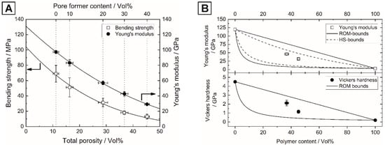 The mechanical properties of the porous HAp ceramics were investigated in terms of Young’s modulus and flexural strength by impulse excitation method and four-point bending. Figure 4A shows the mechanical properties as a function of the total porosity and pore former content. A general decrease in Young’s modulus and flexural strength was observed with increasing porosity. The Young’s modulus and flexural strength could be tailored in a broad range from 97.3 to 29.1 GPa and 69.0 to 13.0 MPa, respectively, by adding 0–40 Vol% of pore formers.