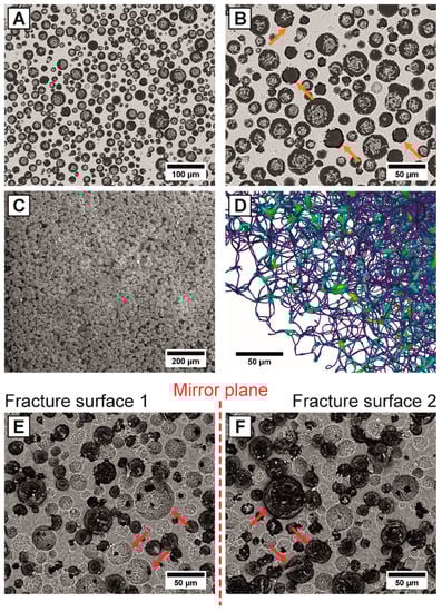 Microstructure of the fabricated HAp/UDMA composites with 40 Vol% of pore formers (A,B): SEM-micrographs show the complete polymer infiltration of all HAp pores (A) and polymerization shrinkage at the HAp/UDMA interface, highlighted by the orange arrows (B). Visualization of the interconnected UDMA-based polymer network (C,D): SEM-micrograph after etching-out the HAp ceramic matrix (C) and reconstructed, skeletonized µCT-polymer network indicating the pore sizes by a color heat-map with blue for pores >1 µm and red color >10 µm (D). Fracture behavior of the HAp/UDMA composites (E,F): The two fracture surfaces of one sample from the flexural testing, showing the fracture at the polymer/ceramic interface associated with 100% pullout effects of all polymeric spheres, highlighted as exemplary by three red arrows (E,F).