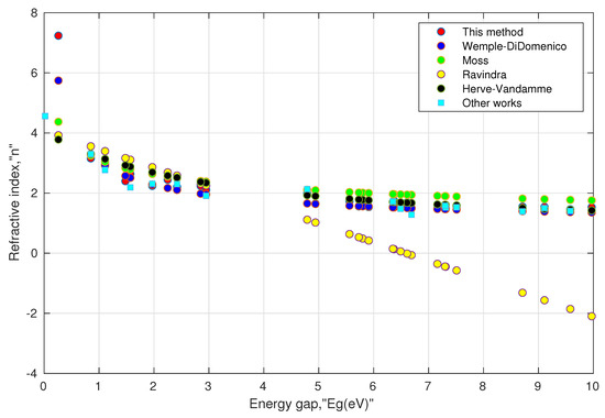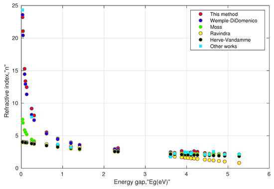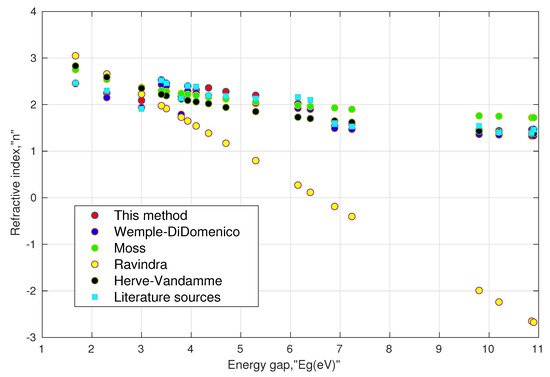 - Ravindra, N. Energy gap-refractive index relation–some observations. Infrared Phys. 1981, 21, 283–285. [Google Scholar] [CrossRef]