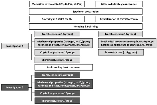 Lithium disilicate glass-ceramic (IPS e.max CAD; Ivoclar Vivadent AG, Schaan, Liechtenstein) were also prepared and served as control; 14 × 14 × 1 mm (n = 10), 4 × 3 × 45 mm (n = 10), and 14 × 14 × 5 mm (n = 5). The specimens underwent a crystallization process in a furnace (Programat P310; Ivoclar Vivadent AG, Schaan, Liechtenstein) according to the manufacturer’s instructions. The materials used in the present study and their sintering conditions are listed in Table 1. The experimental study design is presented in Figure 1.