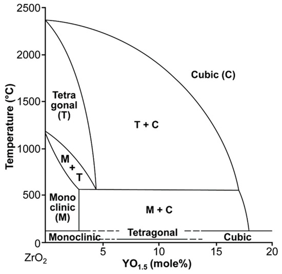 The zirconia specimens were heated in air for 1 h at 1550 °C in order to being employed inside the two-phase (c + t) field, taking into account Scott’s phase diagram (Figure 2) [7]. Then they were rapidly air-cooled within 1–2 min by taking them out from the furnace and dropping them onto a brass plate to prevent diffusional phase separation [11,14,16,17].