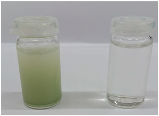 The photographs of WO3 suspensions before (left) and after (right) the exfoliation process.
