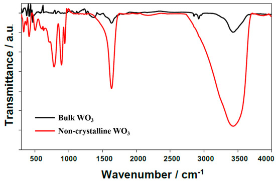 FTIR spectra of bulk and hydrated and non-crystalline WO3.