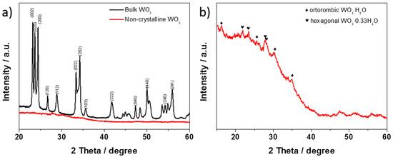 XRD patterns of (a) bulk and hydrated and non-crystalline WO3, (b) only hydrated and non-crystalline WO3.