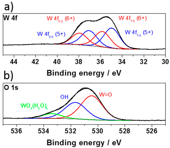 X-ray photoelectron spectroscopy (XPS) analysis was employed to investigate the oxidation states and the presence of oxygen vacancies in the hydrated and non-crystalline WO3. The high-resolution XPS spectra for the tungsten and oxygen region are presented in Figure 6. The W 4f core-level XPS spectrum can be deconvoluted into four peaks corresponding to the W6+ and W5+ states (see Figure 6a). The peaks located at the binding energies of 35.83 and 37.97 eV correspond to the W6+ state, while the peaks at 34.96 and 37.11 eV correspond to W5+. The splitting between W 4f7/2 and W 4f5/2 for the W6+ state is 2.13 eV, which is in good agreement with an earlier report [58]. The emergence of the W5+ oxidation state can be associated with the presence of oxygen vacancies that are formed during exfoliation. Therefore, the chemical structure can be referred to as WO3–x.