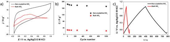 Multiple galvanostatic charge–discharge tests were carried out for both electrodes in a 0.2 M K2SO4 aqueous electrolyte (Figure 7b). The polarization with an anodic and cathodic current gives almost identical capacitance values, indicating a reversible process with over 99% of columbic efficiency (Figure 7c). The electrode that contains the non-crystalline WO3 exhibits a seven times higher specific capacitance than the bulk WO3 due to the higher surface area of the interface between the electrode material and the electrolyte, and a higher concentration of W-OH surface groups that participate in the charge storage process. After a sequence of 1000 charge–discharge cycles, over 92% and 80% of the initial capacitances were maintained for the non-crystalline and bulk WO3, respectively. In the case of the bulk WO3, the capacitance retention after 1000 cycles was lower compared with the modified material. It may be related to the fact that the capacitance of the bulk WO3 mainly comes from the W centers reduction/oxidation and ions’ intercalation/deintercalation, while a modified material utilizes a highly reversible electroactivity of the surface groups.