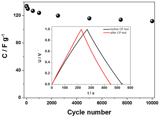 Multiple charge–discharge cycles in a two-electrode configuration for the hydrated WO3−x were performed in order to test the stability of the tested supercapacitor (see Figure 8). As is shown, a very good stability, even after 10,000 cycles, was obtained for the hydrated WO3−x-based capacitor. The capacitance retention between the 1st and the 10,000th chronopotentiometry cycle was equal to 84%. The effect of the capacitance drop was also tracked using chronopotentiometry. The curves recorded before and after a long-term test are presented also in the Figure 8 inset. It is noteworthy that the decrease of the capacitance is the highest at the beginning of the charge–discharge tests, and then the capacitance stabilized after approximately 2000 cycles. This means that the capacitance drop is not related to the electrolyte decomposition, but some irreversible reactions on the material surface.