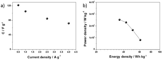 The dependence of the specific capacitance of the hydrated WO3−x electrode on the current density is shown in Figure 9a. The specific capacitance (Cs) was 122 A g−1 and 72 A g−1 at a current density of 0.5 A g−1 and 4 A g−1, respectively. The capacitances were found to decrease by increasing the charge–discharge current. This is because, at a higher current density, the slower processes demonstrate a kinetic resistance and cannot participate in a charge transfer onto or across the electrode/electrolyte interface.