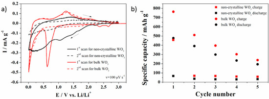The electrochemical performances of the bulk and non-crystalline WO3 electrode materials in a non-aqueous electrolyte are shown in Figure 10a. The first cyclic voltammetry curve for the bulk WO3 exhibits cathodic peaks corresponding to the lithium insertion into the WO3 material (2.65 V and 2.37 V), according to the reaction below: