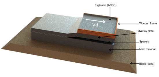 For the research, a Mg/Al/Ti multilayer composite was produced by explosive welding. The process of explosive welding was carried out in the company ZTW EXPLOMET sp.j. Gałka, Szulc (Opole, Poland). The plates used to obtain the investigated composite had dimensions equal to 1200 × 800 mm. The type of explosive used during the process was ANFO (ammonium nitrate fuel oil). The thickness of the explosive layer was 50 mm, the stand-off distances for both Al/Ti and Mg/Al were 5 mm and the initial position angle between plates was 0°. Detonation velocity was equal to 3200 m/s. Before joining, surfaces of the joined materials were polished and cleaned by acetone. The charge initiation point was located in the center of the shorter side of the plate. The schematic of the explosive connection system is shown in Figure 1.