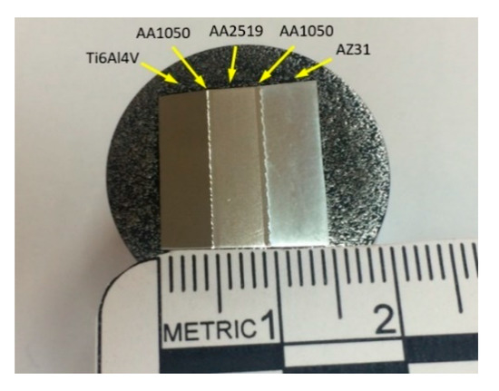 After the joining process, the AZ31/AA1050/AA2519/AA1050/Ti6Al4V multilayer composite was obtained (Figure 3).