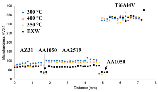 The distribution of microhardness in the investigated composite in the as-welded state (EXW) and after hot-rolling (300C, 350C, 400C).