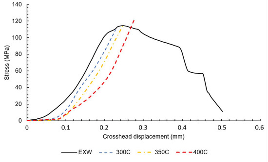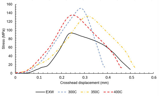 The tensile curves for Mg/Al interface in the as-welded state (EXW) and after hot-rolling (300C, 350C, 400C).