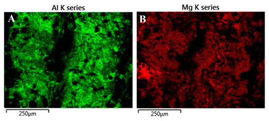 The fractography investigation revealed the brittle mechanism of failure for samples before and after hot-rolling. However, the failure of material after treatment was proceeded through the diffusion layer, which was confirmed by EDX investigation. The results of the element distribution on the fracture surface of Mg/Al mini-specimen after hot-rolling at 400 °C for aluminum (Figure 8A) and magnesium alloy (Figure 8B) are presented below. Obtained maps show that the surface of the fractured sample is characterized by the presence of both aluminum and magnesium. This result suggests that failure occurs in the diffusion layer. In all AZ31/AA1050/AA2519 mini-samples independently on the state of the material, the failure occurs on the AZ31/AA1050 interface, which indicates on lower strength properties of AZ31/AA1050 than AA1050/AA2519 independently on the presence of thick or thin intermetallic phase layer [28].