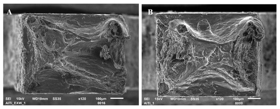 The Al/Ti fracture surfaces of samples EXW (Figure 9A) 400C (Figure 9B) are presented below. The analysis of the obtained fracture surfaces shows that despite the similar character of fracture, the sample subjected to the hot-rolling exhibits a slightly higher participation of ductile fracture.