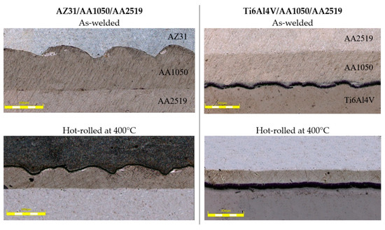 For microstructure analysis, two samples have been chosen: in the as-welded state and after hot-rolling at 400 °C. Light microscopy images of investigated interfaces are presented in Figure 10.