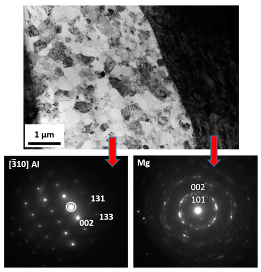 In order to confirm the absence of intermetallic phases and melted zones at the Mg-Al boundary, a phase analysis was carried out using the SAED electron diffraction technique (Figure 12). The TEM results also revealed the occurrence of high plastic deformation in the AZ31 material near the joint and the presence of equiaxial ultrafine grains in the microstructure of AA1050 material with their size about 1 µm.