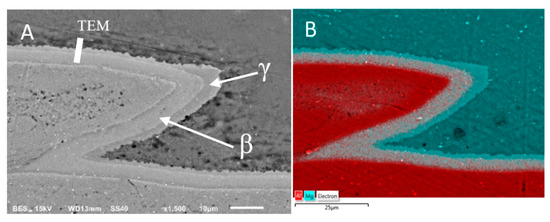 TEM image of AA1050/Ti6Al4V joint microstructure in hot-rolled state (A), with selected area diffraction patterns (SAED) (B). TEM lamella position in Figure 17.