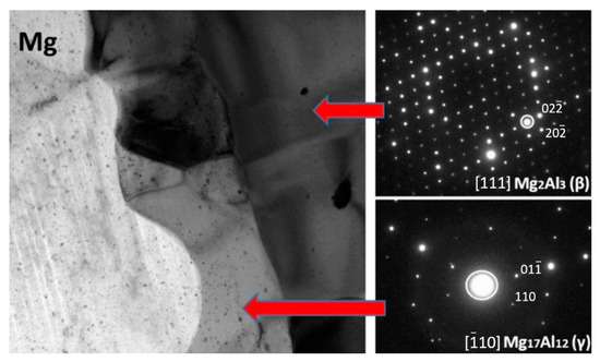 It should also be noted that there are disproportions in the thickness of the individual intermetallic phases (maximum 4.5 µm for β and 9 µm for γ), resulting in differences in their growth rates (Figure 13). In order to confirm the presence of intermetallic phases β and γ at the Mg-Al limit, a phase analysis was performed using the SAED electron diffraction technique (Figure 14). The higher-resolution observation revealed a lack of cracks or delamination between intermetallic layers and base materials. The TEM investigation revealed coarsened equiaxed grains in the microstructure of AZ31.