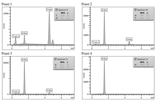 Similarly, as in the case of Al/Mg bonds, the joint AA1050/Ti6Al4V is also a potential area of intermetallic phase growth. Analyzing the titanium-aluminum phase balance system, four intermetallic compounds can be identified: Ti3Al (α2), TiAl (γ), TiAl2 and TiAl3. In contrast to the stoichiometric TiAl3 and TiAl2 phases, the Ti3Al and TiAl phases are present in a wide range of aluminum contents. The research results of the as-welded AA1050/Ti6Al4V joint revealed the presence of the melted zone with localized intermetallic particles (Figure 15A). The analysis of Ti and Al elements distribution on the sample surface—EDX allows to observe the mixture character of the melted zone (Figure 15B). Element compositions corresponding to the spectrums in Figure 15B are presented in Figure 16.