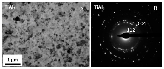 The TiAl3 intermetallic phase is most likely from a thermodynamic point of view. In the case of Al/Ti, intermetallic growth is in the nature of precipitation rather than layered growth, like in the case of the Mg/Al interface. The presence of TiAl3 was confirmed by TEM observation and the results of the SAED electron diffraction technique (Figure 18). Investigations revealed ultrafine precipitates of the TiAl3. The size of the precipitates was approximately 100 nm.