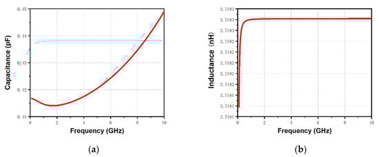 The three components of the capacitor CC, the resistor RC, and the inductor LC are introduced to construct the model of the embedded center dendritic capacitor, taking the inductive effect and ohmic loss into consideration. However, the complex structure of the center capacitor results in difficulties in calculating the above parameters. Therefore, the simulated S-parameters and Y-parameters are introduced to calculate the capacitance, resistance, and inductance as given in Equations (9)–(11) [21]. In addition, the capacitance of the center capacitor can be tuned to match the design target by optimizing the size. The frequency-dependent simulation results of the capacitance, resistance, and inductance of the optimized center capacitor are shown in Figure 3.