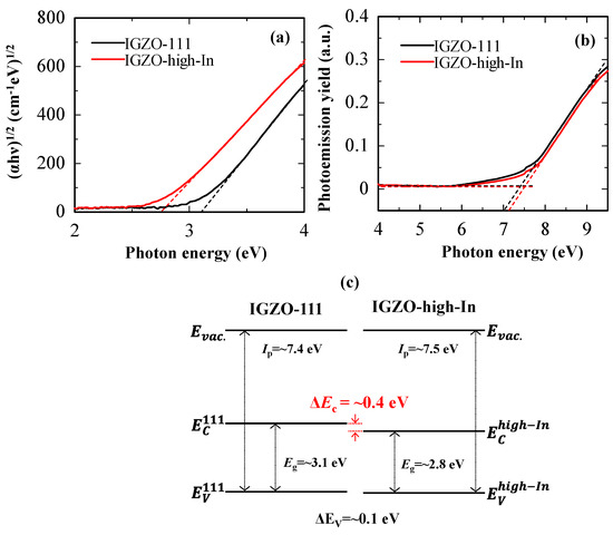 Optical band gap (Eg) was estimated by Tauc plot. Valence band maximum (VBM) of the IGZO films was estimated from an ionization potential (Ip), which was measured by photoelectron yield spectroscopy (Bunkoukeiki, BIP-KV202GD, Tokyo, Japan). Figure 3a,b show the Tauc plots and photoemission yield of the IGZO layers. The optical band gaps of the IGZO-111 and the IGZO-high-In layers were estimated to be ~3.1 and ~2.8 eV, respectively. VBMs of the IGZO-111 and the IGZO-high-In layers were ~7.4 and ~7.5 eV, respectively. Since conduction band minimum (CBM) of IGZO mainly consists of In-5s orbitals [30,31,32], CBM of the IGZO layer would be influence by an In ratio. From these results, the energy band diagram of the IGZO-111 and the IGZO-high-In layers was shown in Figure 3c, suggesting that a ΔEc of ~0.4 eV might be formed at the heterojunction interface.