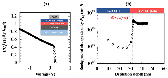 To confirm steepness at the heterojunction interface, the depth profile of background charge density (Nbg) was evaluated by a Schottky diode (SD) with the heterojunction channel as shown in Figure 4a. Detailed fabrication process of the IGZO SD was reported elsewhere [33]. For the SD with the heterojunction channel, channel thicknesses for the each IGZO layer were set at 30 nm. Carrier density (ne) of the IGZO-111 was set at ~1 × 1017 cm−3 to obtain good Schottky contact, while that of the IGZO-high-In was set at ~3 × 1018 cm−3 to enhance the difference of Nbg at the heterojunction interface. The Nbg was estimated using an equation as shown below [34,35];
