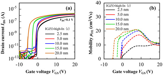 Figure 5 shows the transfer characteristics of the homo-IGZO-111 and the IGZO-high-In TFTs. Owing to the optimization of a channel thickness and an oxygen flow ratio during the channel deposition [36,37], Vth of the homo-IGZO-111 and the IGZO-high-In TFTs were close to zero. From μFE-VGS curve shown in Figure 5, μFE of both the homo-IGZO TFTs increased with increasing VGS. The homo-IGZO-high-In TFT exhibited μFE of 22.9 cm2 V−1 s−1, which is approximately two times higher μFE than that of the homo-IGZO-111 TFT (12.4 cm2 V−1 s−1). This result indicates that μFE improvement of the homo-IGZO-high-In TFT was originated by a high-In composition, since large spherical In 5s orbitals mainly form carrier transport paths [26,30,31].