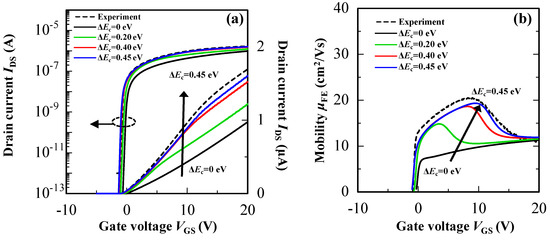 Simulation results of (a) transfer characteristics and (b) μFE-VGS curves of the hetero-IGZO TFTs with different ΔEc. The broken line is an experimental result of the hetero-IGZO TFT.
