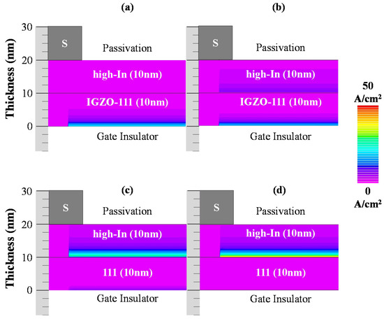 Drain current densities in the hetero-IGZO TFTs with ΔEc of the (a) 0 eV, (b) 0.2 eV, (c) 0.4 eV, and (d) 0.45 eV. The insert is the color coding for the drain current density at VGS = +10 V (VDS = 0.1 V).